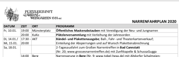 Der Narrenfahrplan ist ab sofort im internen Bereich der Homepage für alle Mitglieder als Download verfügbar. Diesen bekommt ihr in Papierform – ebenso wie unser brandneues und druckfrisches Plätzlermagazin –…