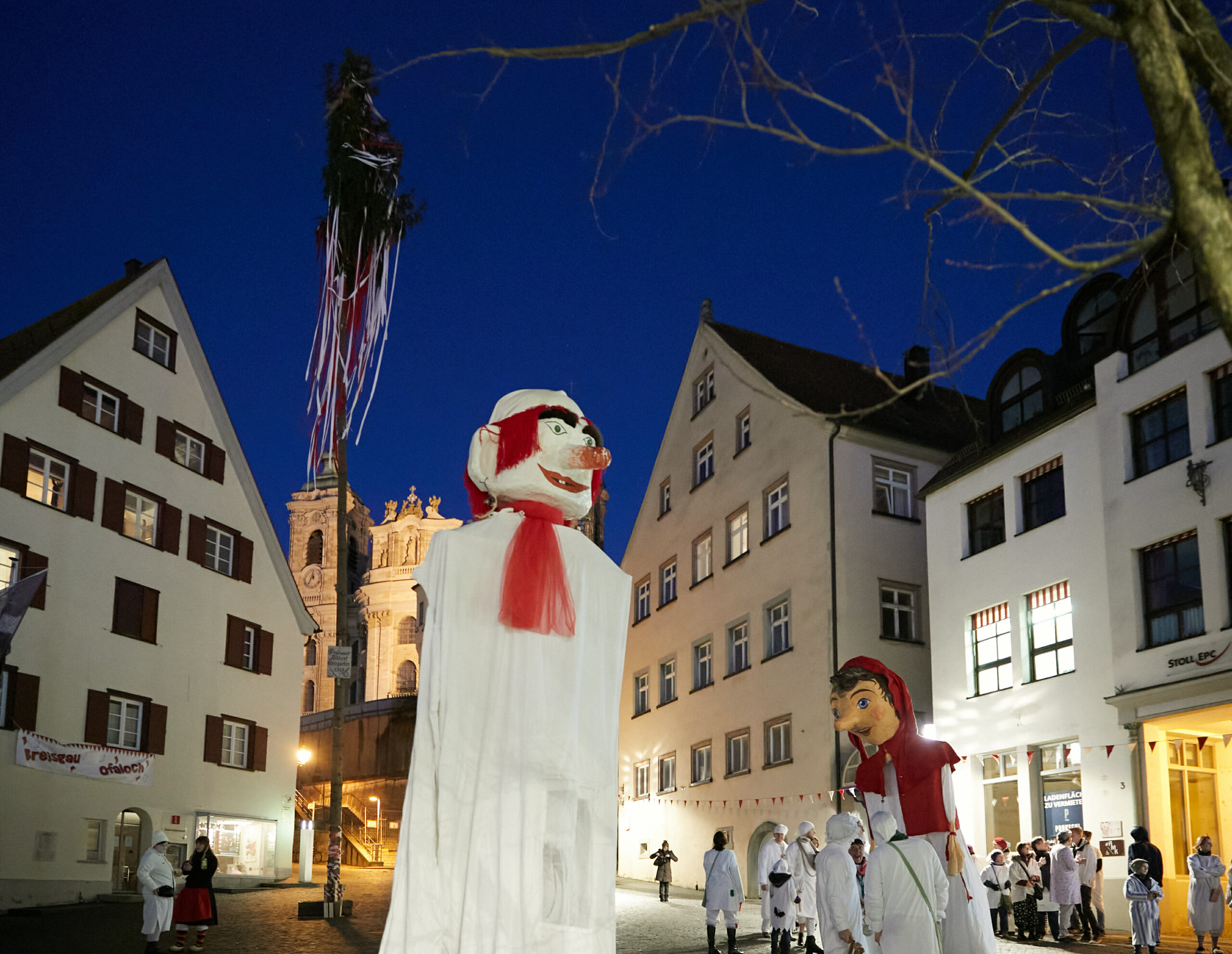Der Narrenbaum wir auf dem Münsterplatz durch die Zimmermänner aufgestellt. Nach vollbrachter Arbeit und dem Tanz um den Baum geht es weiter vor das Rathaus.