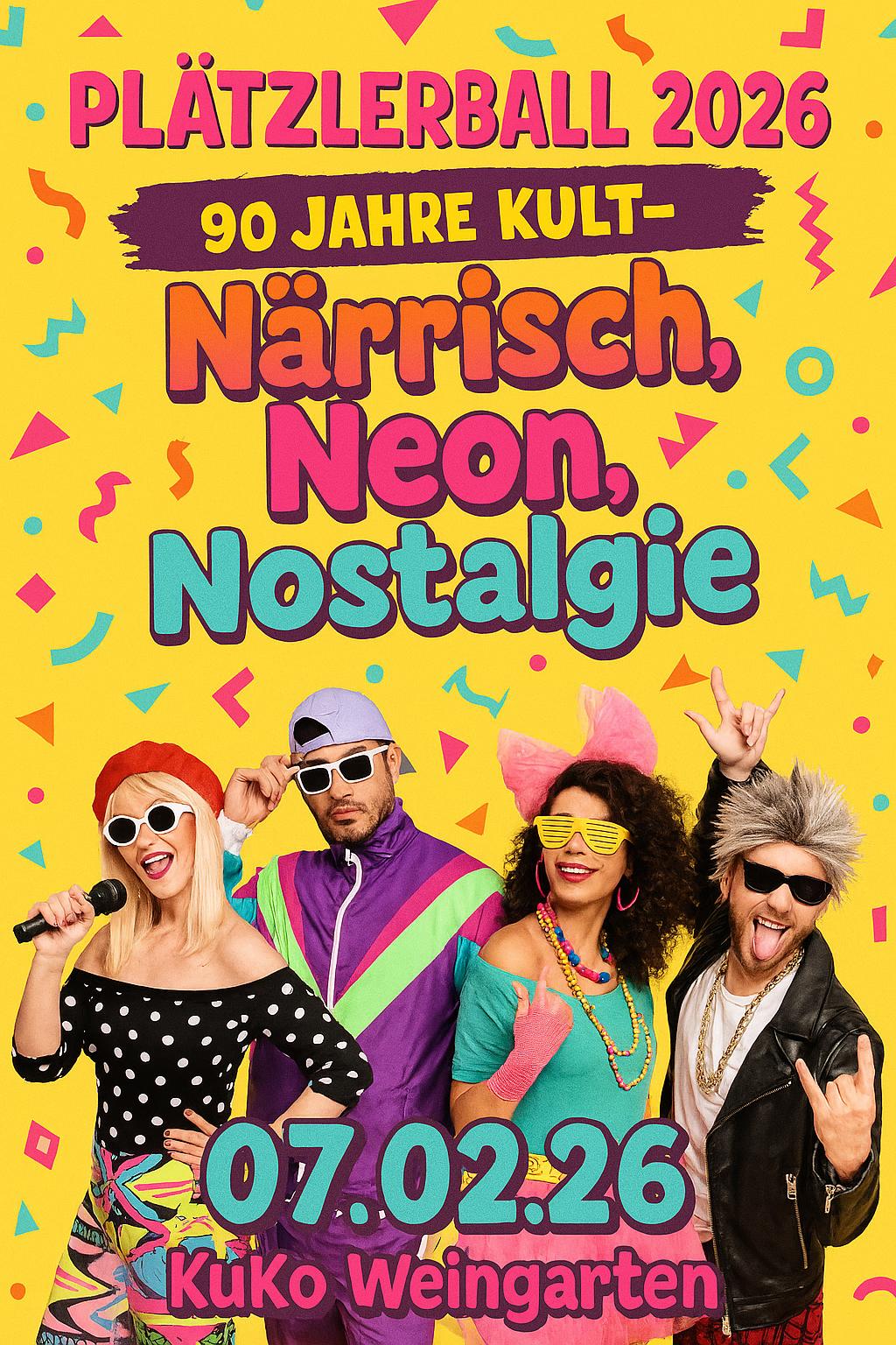 Der Plätzlerball feiert sein 90-jähriges Jubiläum – und wir feiern gleich doppelt: den Ball und die wilden 90er Jahre! Unter dem Motto närrisch, neon, Nostalgie erwartet euch eine unvergessliche Nacht voller Farben, Spaß und Erinnerungen. Damit musikalisch für alle etwas dabei ist, gibt es gleich zwei Floors: von stimmungsvoller Tanzmusik bis zu den besten Partyhits…